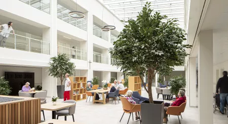 In deze open ruimte, voorzien van gezellige zithoeken, een centrale stamtafel, bomen en veel planten kunnen bewoners elkaar ontmoeten voor een gezellig samenzijn of activiteit. De ruimte is polyvalent ingericht waardoor deze zeer eenvoudig kan worden heringericht om er evenementen (vb. Kerstmarkt) en activiteiten (vb. Turnclub) te laten plaatsvinden.